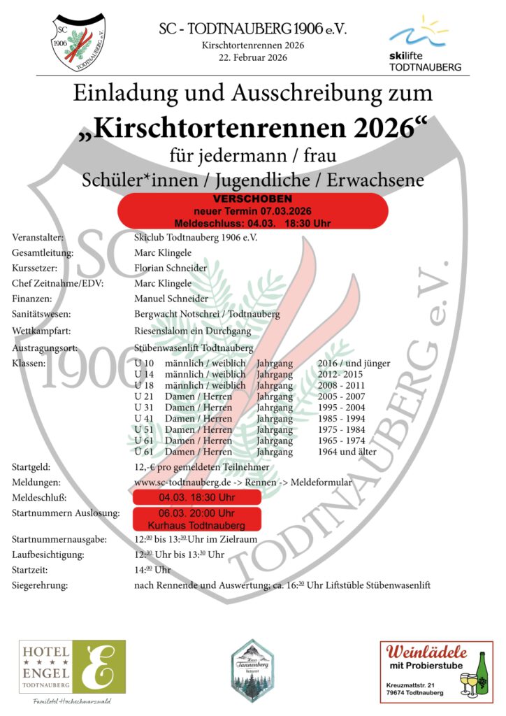 leider müssen wir bekannt geben, dass das Kirschtorenrennen das für den 22.02.2026, mangels Teilnehmer nicht am kommenden Sonntag stattfinden wird.